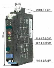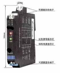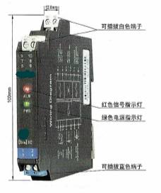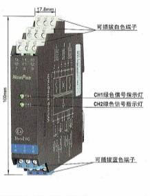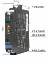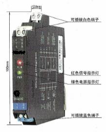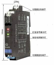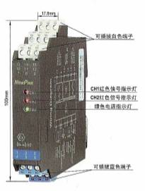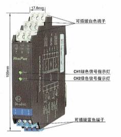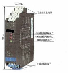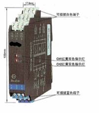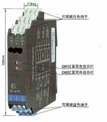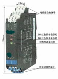 CH1、CH2:信号状态指示灯(红黄双色)。输入信号断路或短路时,相应通道的指示灯显示为红色;输出回路闭合时,相应通道的指示灯显示为黄色。