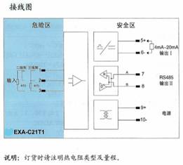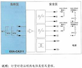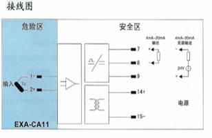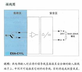 将来自危险区的热电偶信号,经隔离转换为4mA~20mA电流信号或回路供电输出4mA~20mA电流信号到安全区,自动补偿冷端温度。