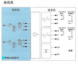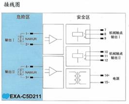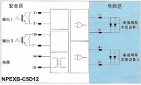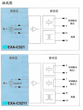 将危险区的NAMUR接近开关信号,经隔离转换输出到安全区,输出方式为两路继电器输出,同时可进行反相选择。